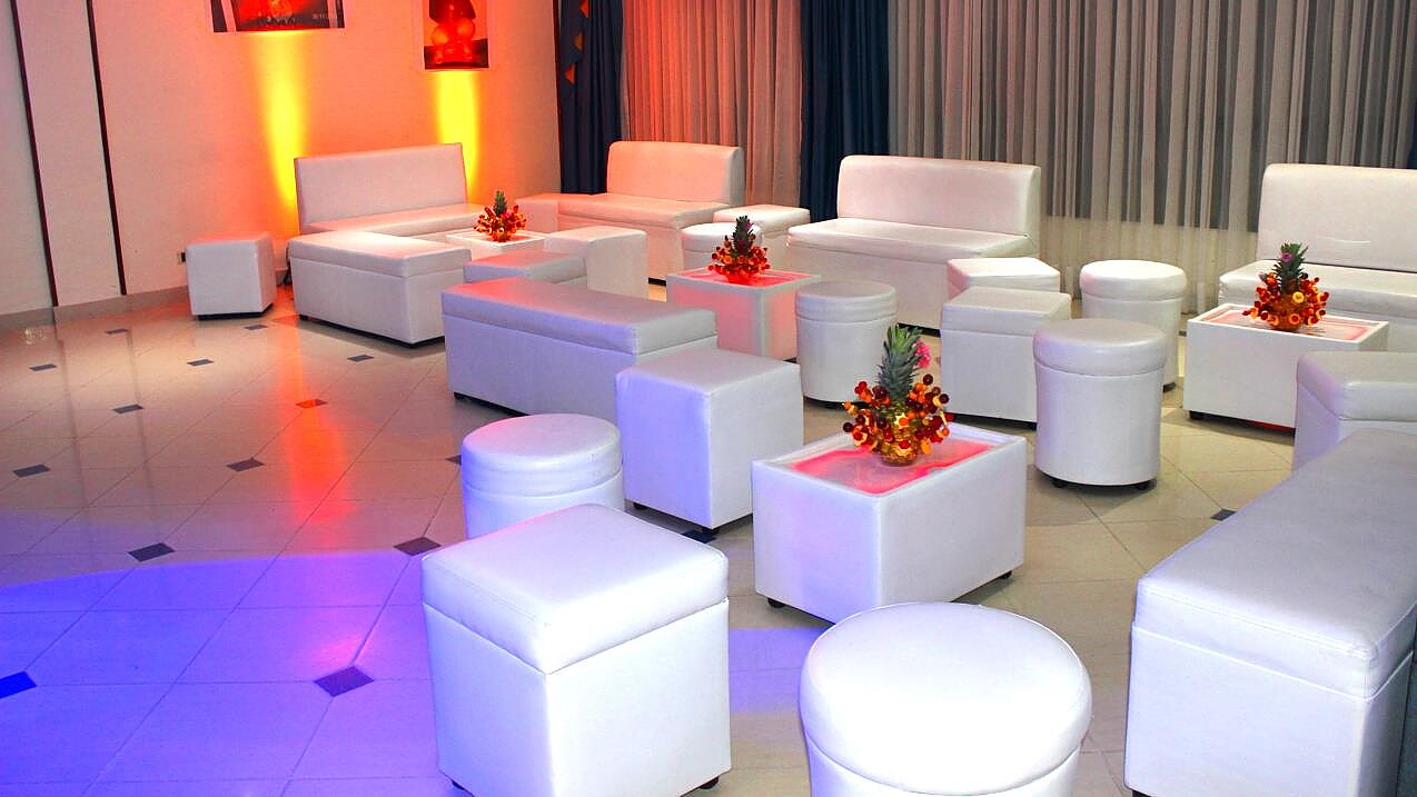 Servicio de alquiler de salas lounge en Bogotá para fiestas y eventos, salas blancas, puff, mesas de centro iluminadas LED inalámbricas (sin cables).